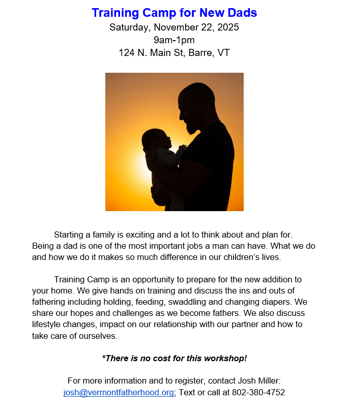 - Drop in at Vermont Fatherhood! No registration required.